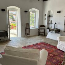 External steps lead up to the first floor where there is a spacious living room and central fireplace. Typical Hydriot style with stone flooring and wooden beams across the ceiling.